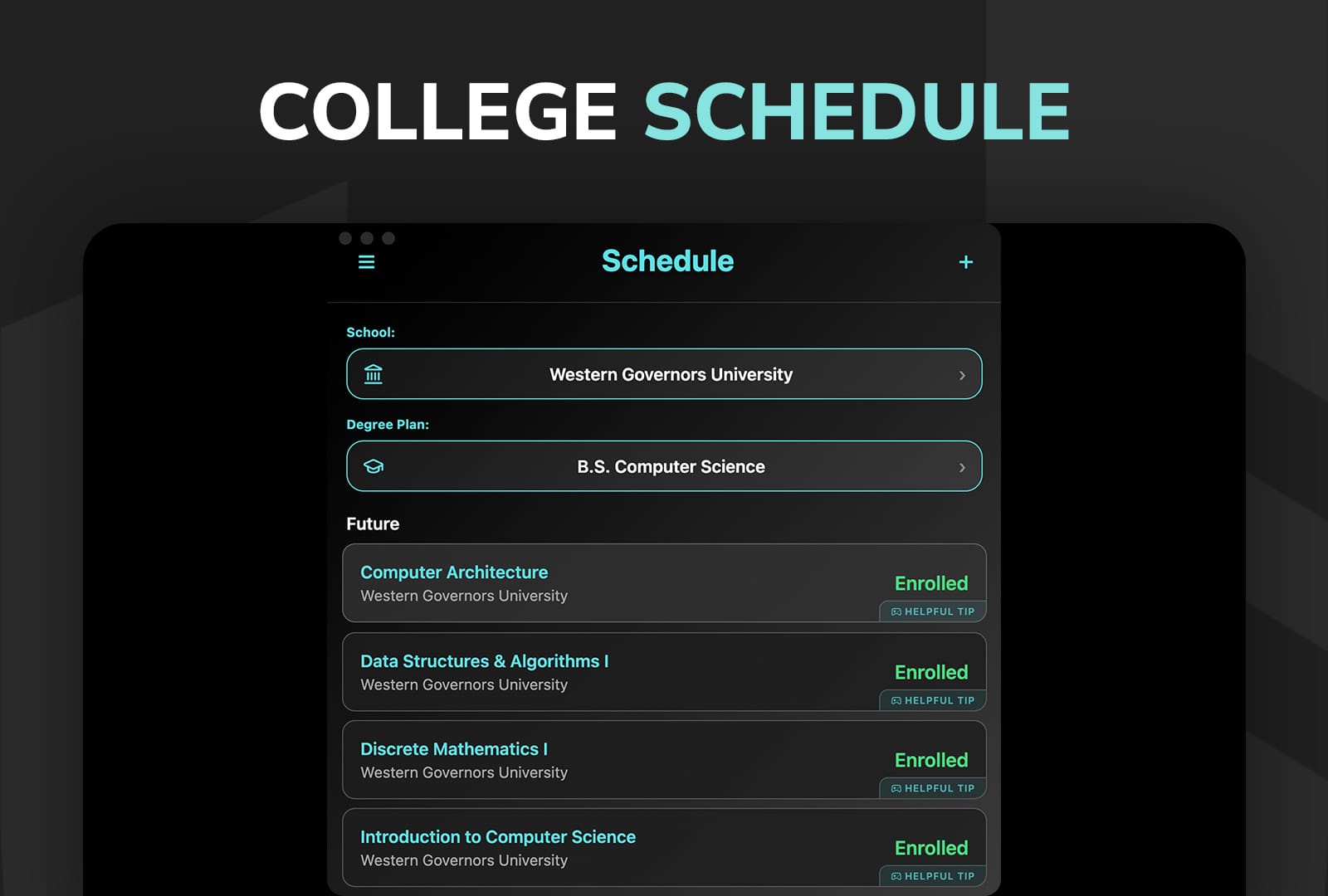 Track your College Schedule + the Desktop App has an exclusive WGU How to Pass feature which helps you pass any WGU Course in record time with links to curated study resources such as Reddit Threads users have posted, Reddit Search on the course, YouTube playlist picked out for you, or a UniBoost Study Guide. The feature works on ANY WGU Degree! To enable to How to Pass Feature, you must enter in the course code and not just the course name.