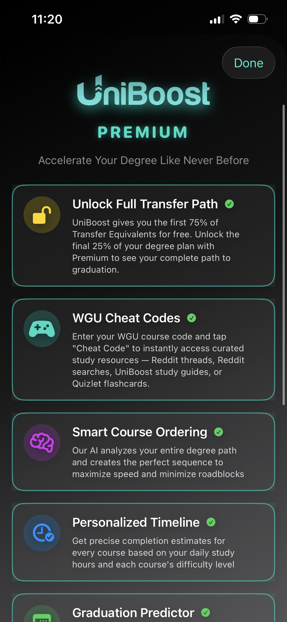 Track your current schedule in real-time, and when you're done, click "Finish Course" which will add your finished course to the Transcript section. Also check out the new Premium WGU Cheat Codes feature that helps you graduate any WGU Bachelor's or Master's Degree faster!